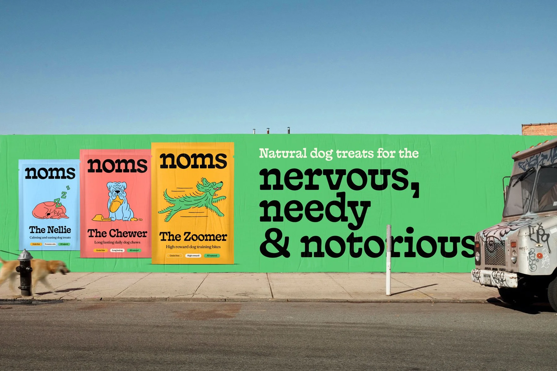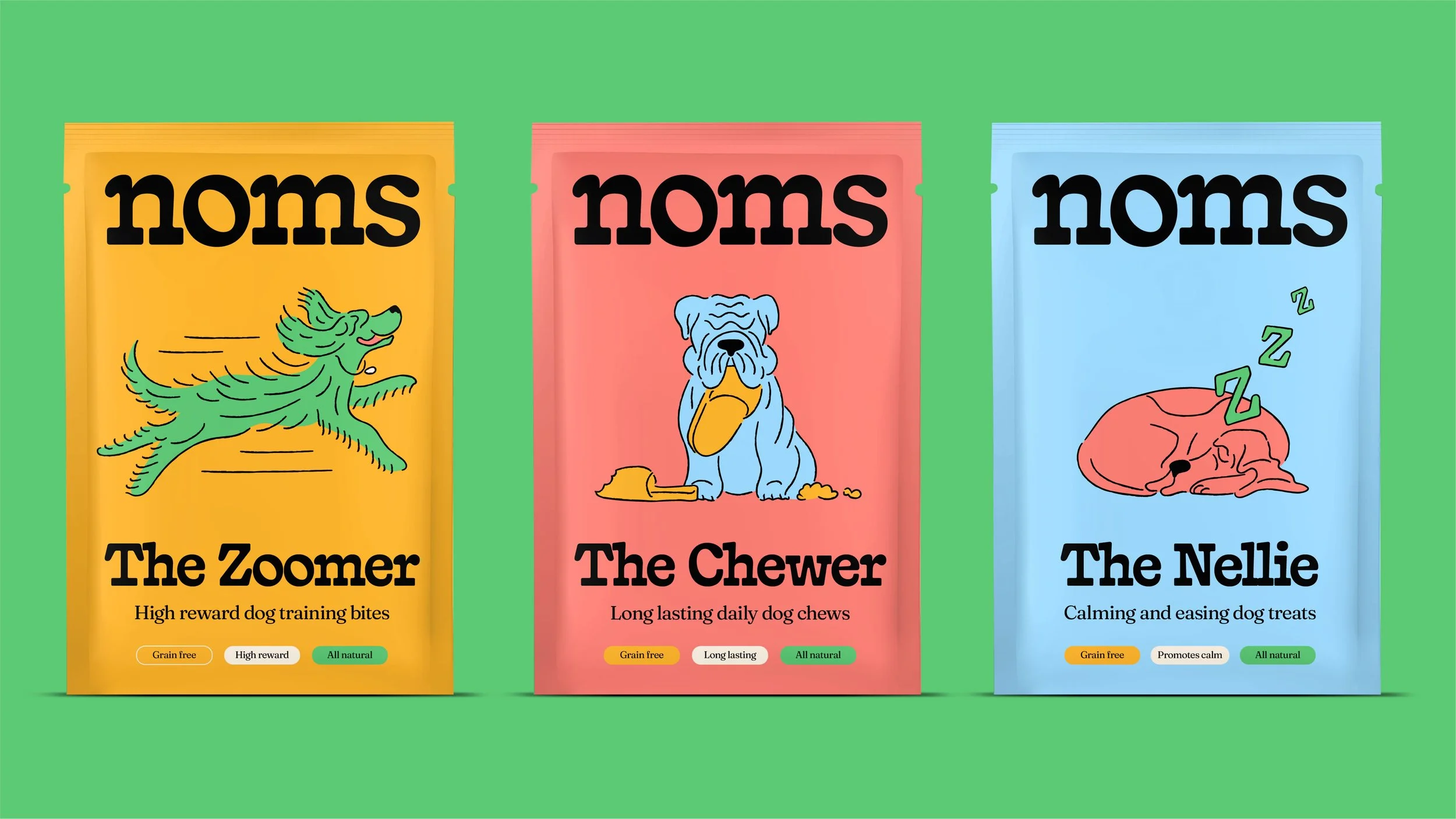 Noms create natural dog treats that support all dog personalities. Through illustration and minimal packaging, the brand celebrates dogs’ individual quirks and natures. From nervous to notorious and everything in between, Noms is designed to connect with pet owners through the fun and unique traits dogs bring.